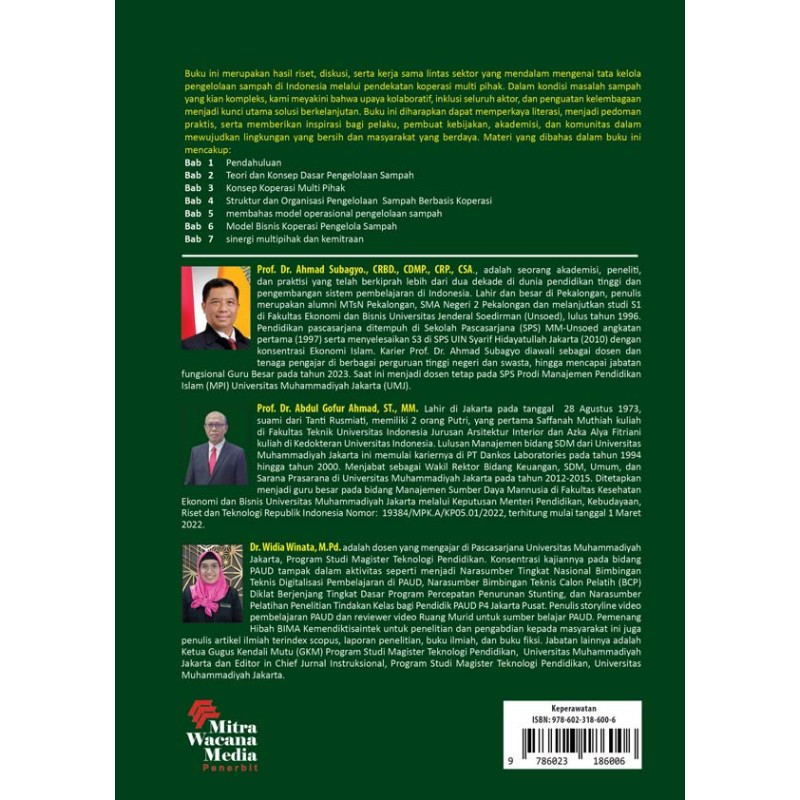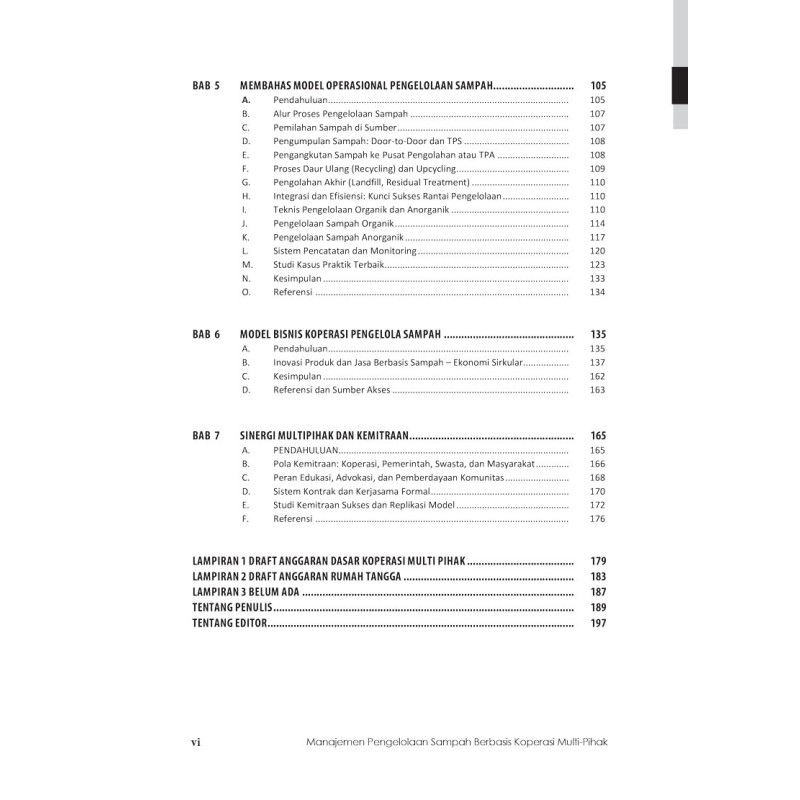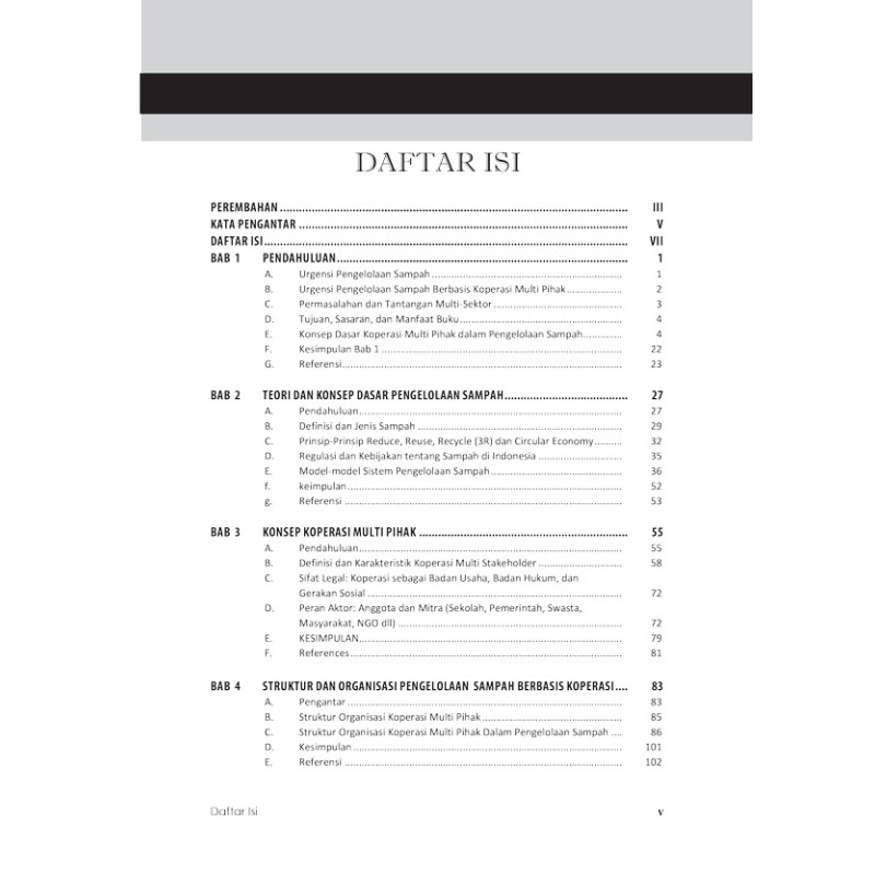 Buku ini merupakan hasil riset, diskusi, serta kerja sama lintas sektor yang mendalam mengenai tata kelola pengelolaan sampah di Indonesia melalui pendekatan koperasi multi pihak. Dalam kondisi masalah sampah yang kian kompleks, kami meyakini bahwa upaya kolaboratif, inklusi seluruh aktor, dan penguatan kelembagaan menjadi kunci utama solusi berkelanjutan. Buku ini diharapkan dapat memperkaya literasi, menjadi pedoman praktis, serta memberikan inspirasi bagi pelaku, pembuat kebijakan, akademisi, dan komunitas dalam mewujudkan lingkungan yang bersih dan masyarakat yang berdaya. Materi yang dibahas dalam buku ini mencakup :